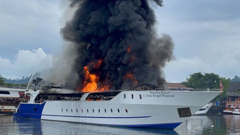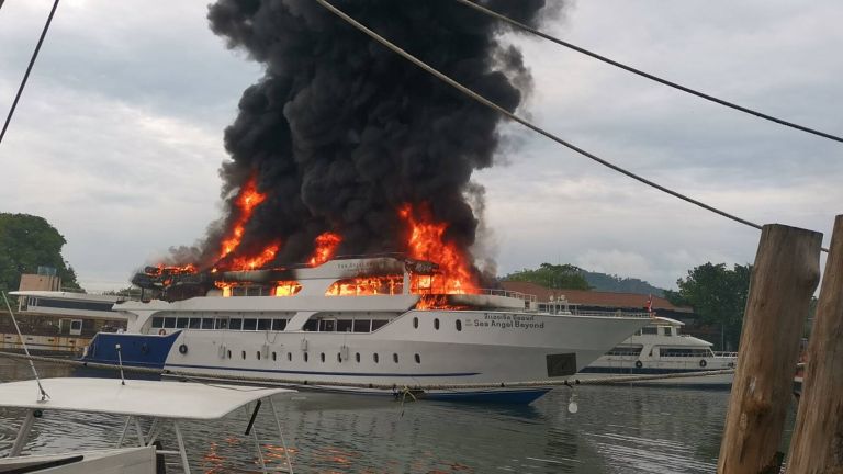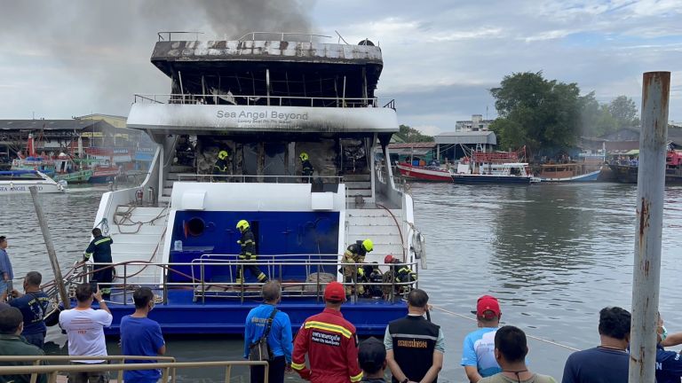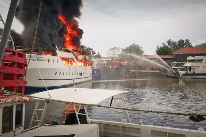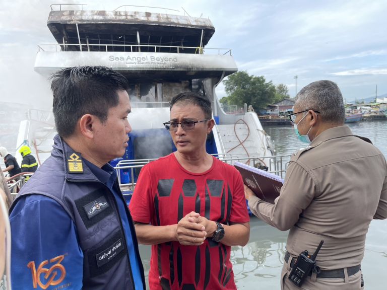 The villagers informed Phuket City Police Department Deputy Inspector (Investigation) Pol. Captain Wichit Nokkaew that a luxury cruise liner had docked. Mr. Anupap Yodrabam, Deputy Governor of Phuket, Mr. Natchaphong Pranit, Director of Phuket District Port Office, and Mr. Suwit Suriyawong, Police Superintendent of Mueang District, worked together to construct the floating pier in Ratsada Subdistrict, Mueang District. Phuket directs Ratsada Subdistrict Firefighters from the Municipality Phuket City Municipality Wichita Municipality, Phuket Marine Police, and other organizations to investigate the fire.