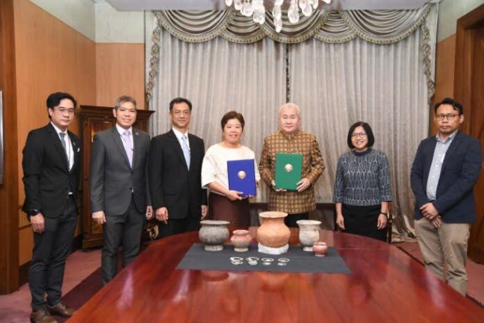 The artifacts, which include five clay-fired pottery items and eight iron bracelets, were officially handed over to the Department of Fine Arts in a ceremony held by the Ministry of Foreign Affairs. The event was attended by high-ranking officials, including Nattapol Kanthahiran, Deputy Permanent Secretary for Foreign Affairs, and Phanombut Chantarachot, Director-General of the Department of Fine Arts.