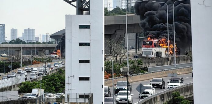 Bus Fire on Si Rat Expressway Causes Traffic Jam, No Injuries Reported