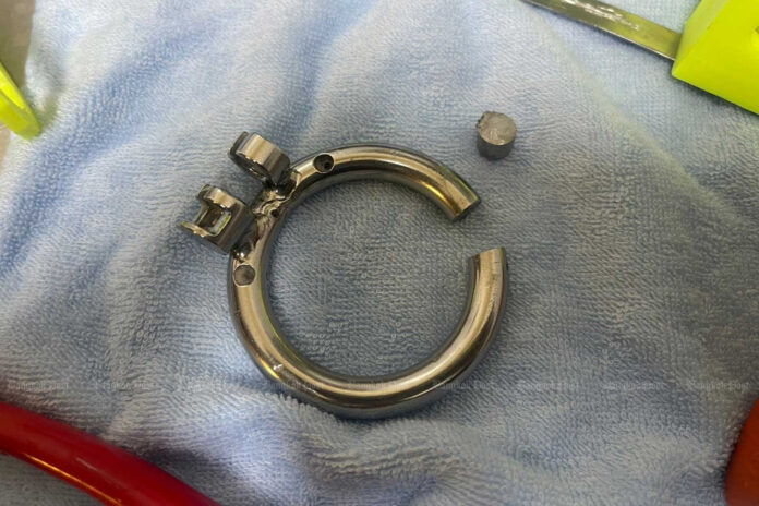 Mr. Thanapong Ok-Oun, the cut-off equipment officer, and Mr. Jerasak Nuchlek, Chao Sawangboriboon Thammasathan, Pattaya City, confirmed that they were alerted by concerned members of the public regarding the foreign man’s plea for help. It was reported that the incident occurred at the South Pattaya Dormitory, where the tourist had mistakenly placed the stainless steel ring on his genitals.