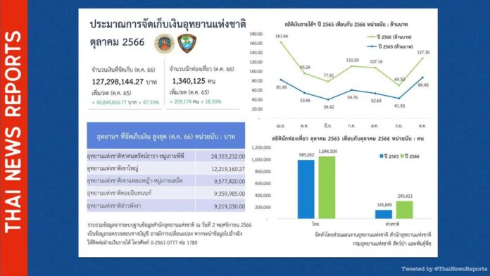 During October 2023, a staggering 1,340,125 visitors explored Thailand’s national parks, marking an impressive increase of 18.50% from the previous year. Simultaneously, the amount of money collected soared to 127,298,144.27 baht, reflecting a substantial growth of 47.33%. This surge can be attributed to the influx of 1,044,504 Thai tourists and 295,621 foreign tourists, signifying a robust appeal to both domestic and international travelers.