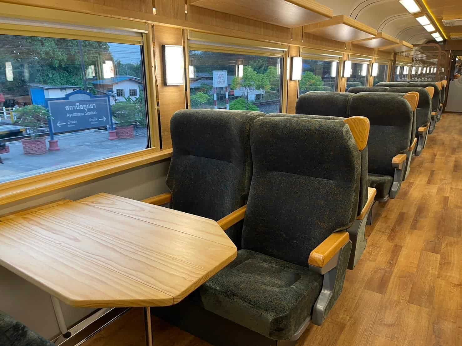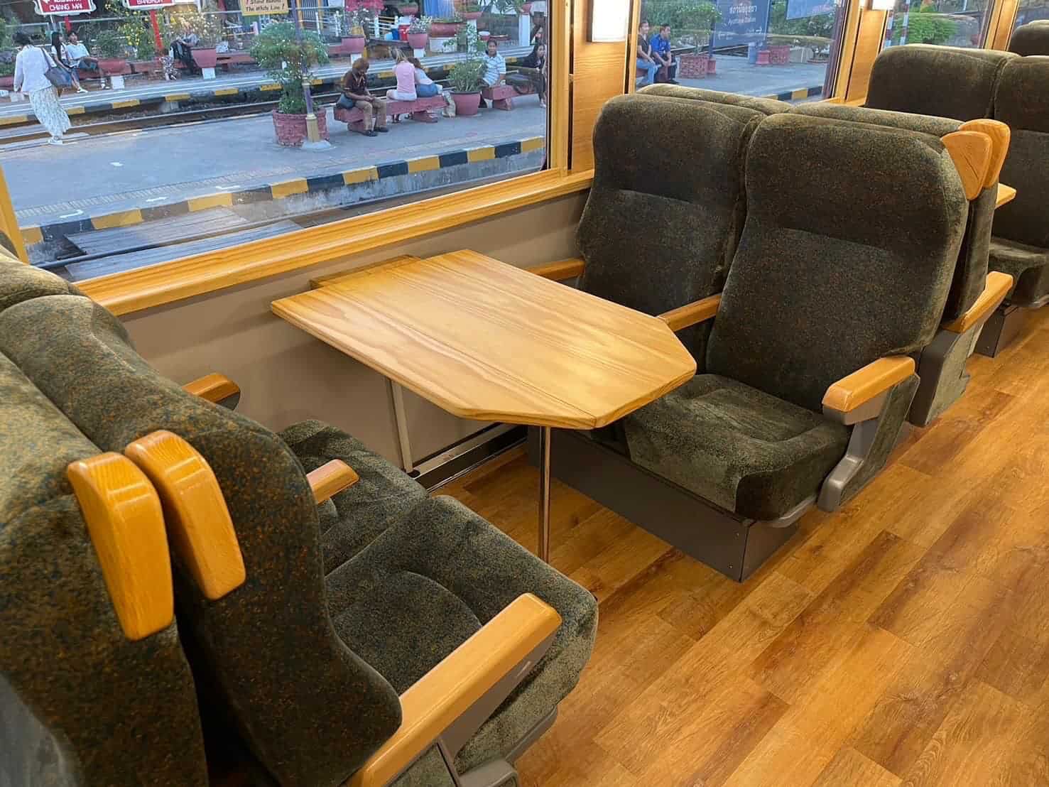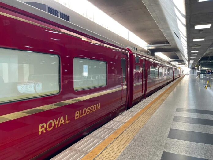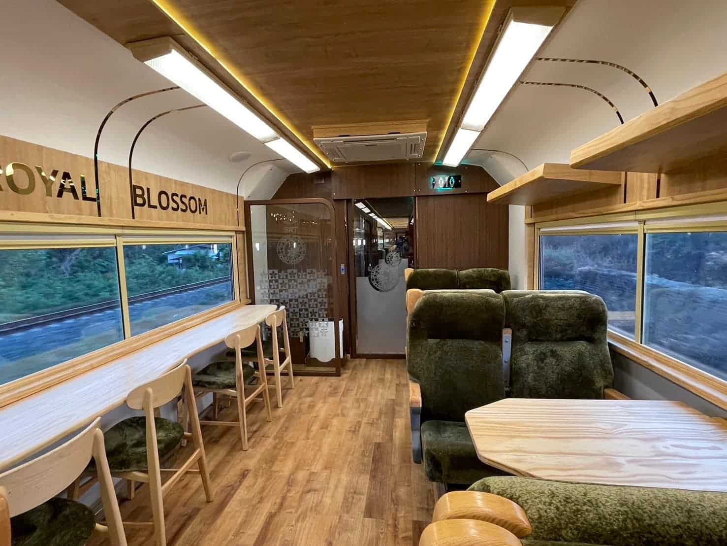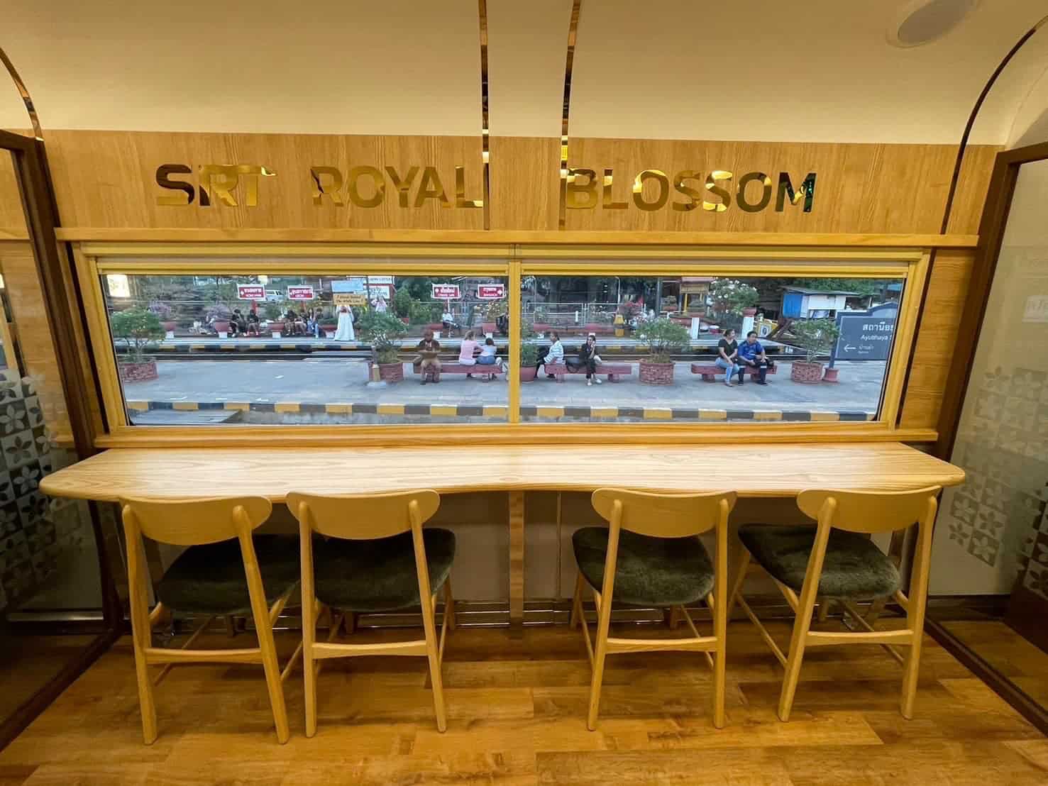 Externally, the Royal Blossom coaches are adorned with a cherry red and gold livery, reminiscent of cherry blossoms, symbolizing the uniqueness of this tourist train. The carriages feature a distinctive logo, “State Railway of Thailand Royal Blossom since 2022,” accompanied by the Royal Crown flower, denoting a new era of travel.