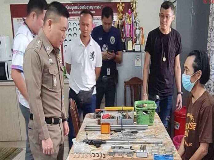 The suspect, known as Jakrapong or Rot, was apprehended with a substantial arsenal of weapons and manufacturing equipment. Police Colonel Trithep Phattharathan and his team led the raid, revealing a clandestine workshop equipped with tools and components essential for gun production.