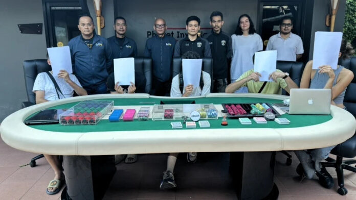 Undercover officers from the Phuket City Police Station executed a raid on a residence along Thepkrasattri Road in Phuket Town’s Ratchada sub-district at 1:45 a.m. on Wednesday, March 20. Acting on a tip-off suggesting illicit gambling activities, the authorities monitored the location before witnessing the door swing open, prompting their intervention.