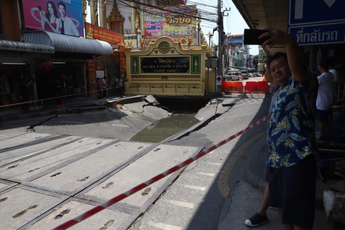 Upon arrival at the scene, officials discovered the gaping hole at the head of Pak Kret Tha Nam Road in Pak Kret District, Nonthaburi Province. The collapse, situated in front of Wat Bo at number 110, Village No. 2, Pak Kret Subdistrict, drew the attention of local villagers, including monks, who were startled by the sudden development.