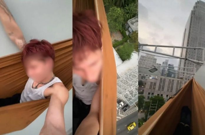 A foreign man is under scrutiny after posting a video of himself lying in a hammock suspended from a large billboard near the Asoke Intersection in Bangkok. The video has sparked outrage on social media, highlighting concerns about his reckless behavior.