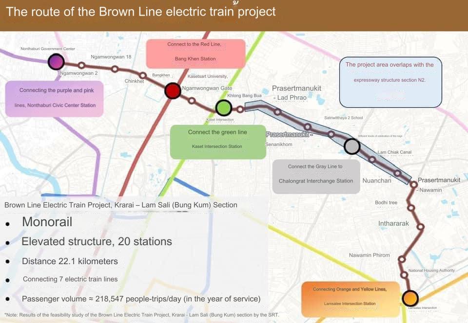 The Mass Rapid Transit Authority of Thailand (MRTA) is advancing plans for the Brown Line electric rail project, connecting Khae Rai to Lam Sali in Bangkok. The 22.10-kilometer project is currently undergoing revisions to its design and public-private partnership (PPP) framework, in alignment with the government’s policy of capping fares at a maximum of 20 baht for the entire line. It is expected that once the new chairman of the MRTA board is appointed, the revised plans will be submitted for approval.