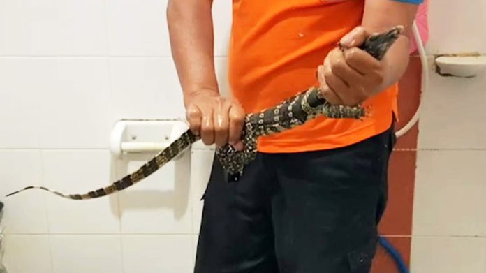 Pathum Thani residents were startled late Sunday night when an Asian water monitor was discovered in their bathroom toilet. The Pathum Thani Snake Association’s Volunteer Radio Center was called to a housing estate near Khlong 2, Soi Bongkot 14, where the reptile’s head was seen poking out of the toilet bowl.