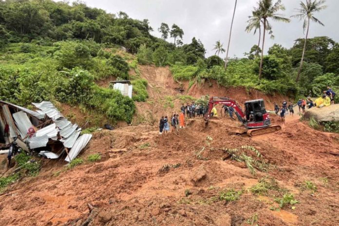 The incident occurred at 4 a.m. in a workers’ camp on a mountain slope in Soi Hima Thong, tambon Maret, where a resort development project is underway. The landslide, triggered by heavy rain, buried one of the shelters.