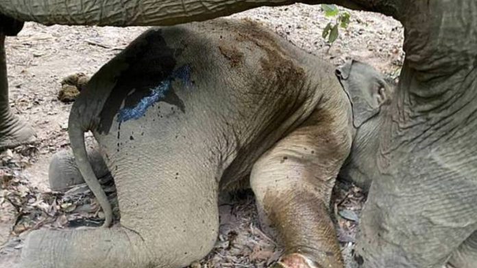 A baby elephant trapped in an animal snare was successfully rescued and treated for an infected wound in Chon Buri’s Si Racha district yesterday, thanks to the coordinated efforts of forest officials and veterinarians.